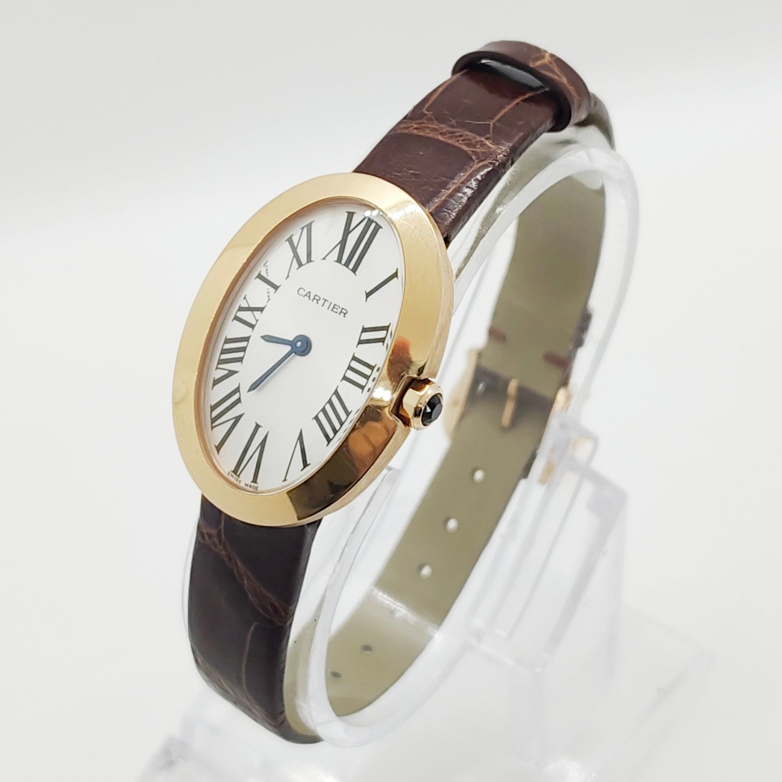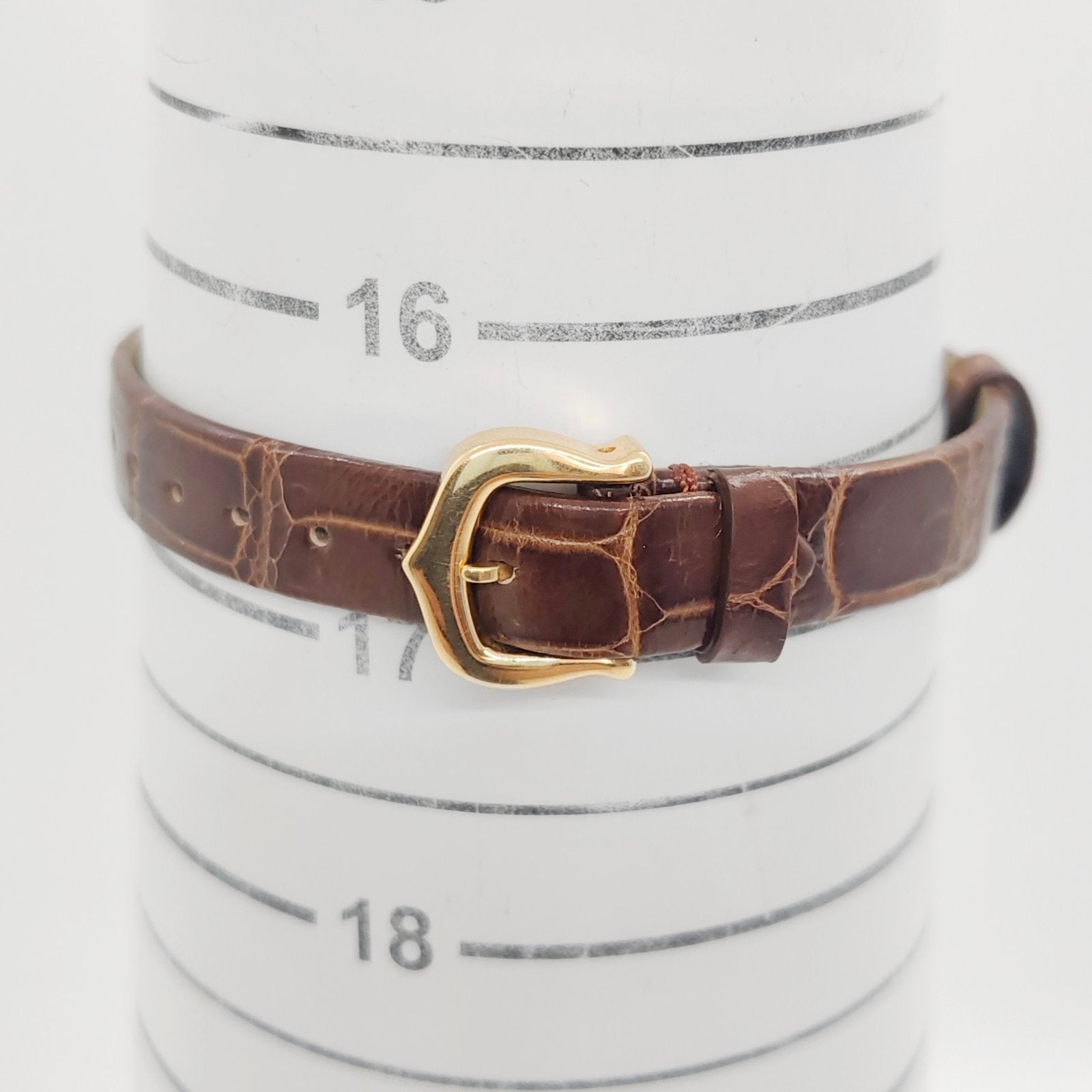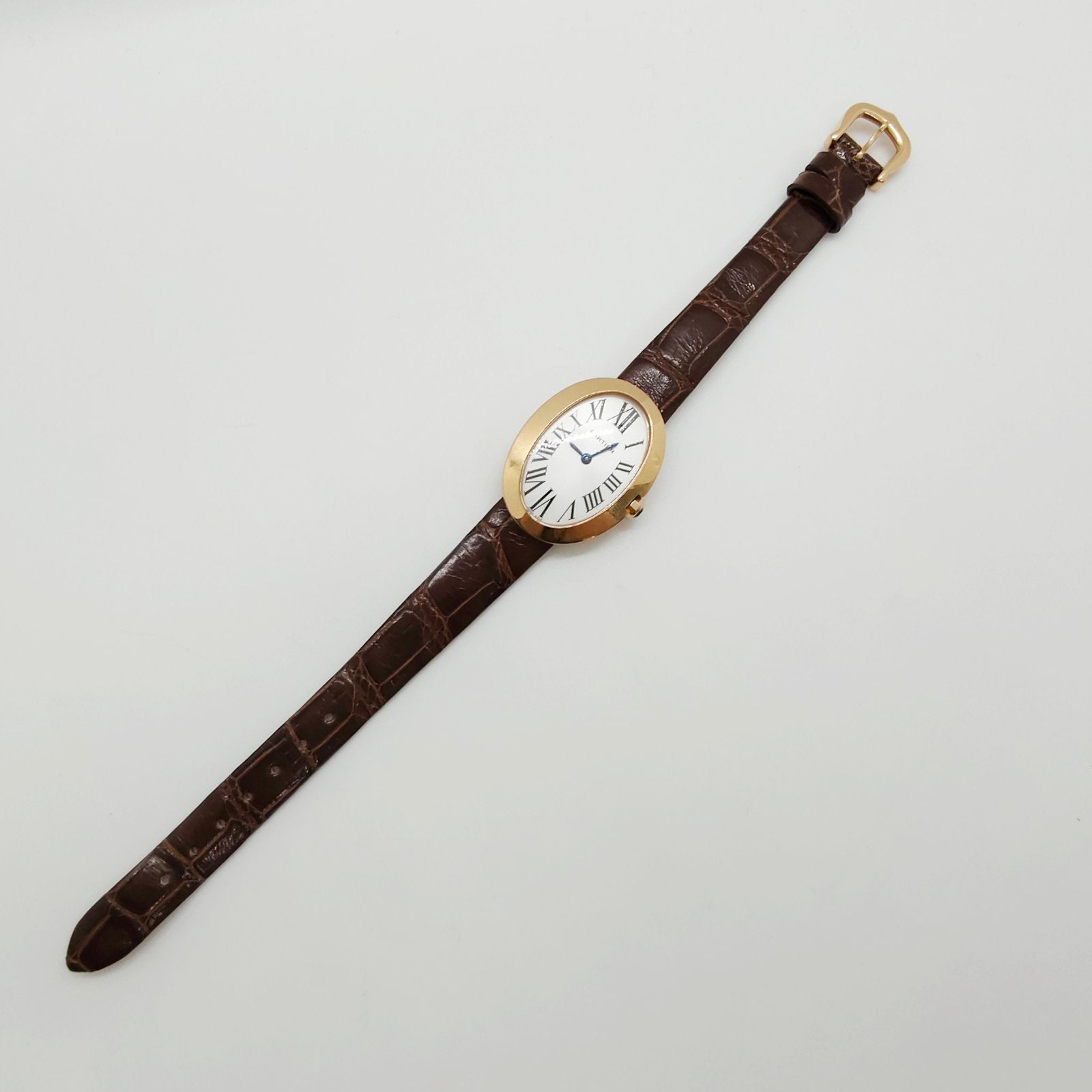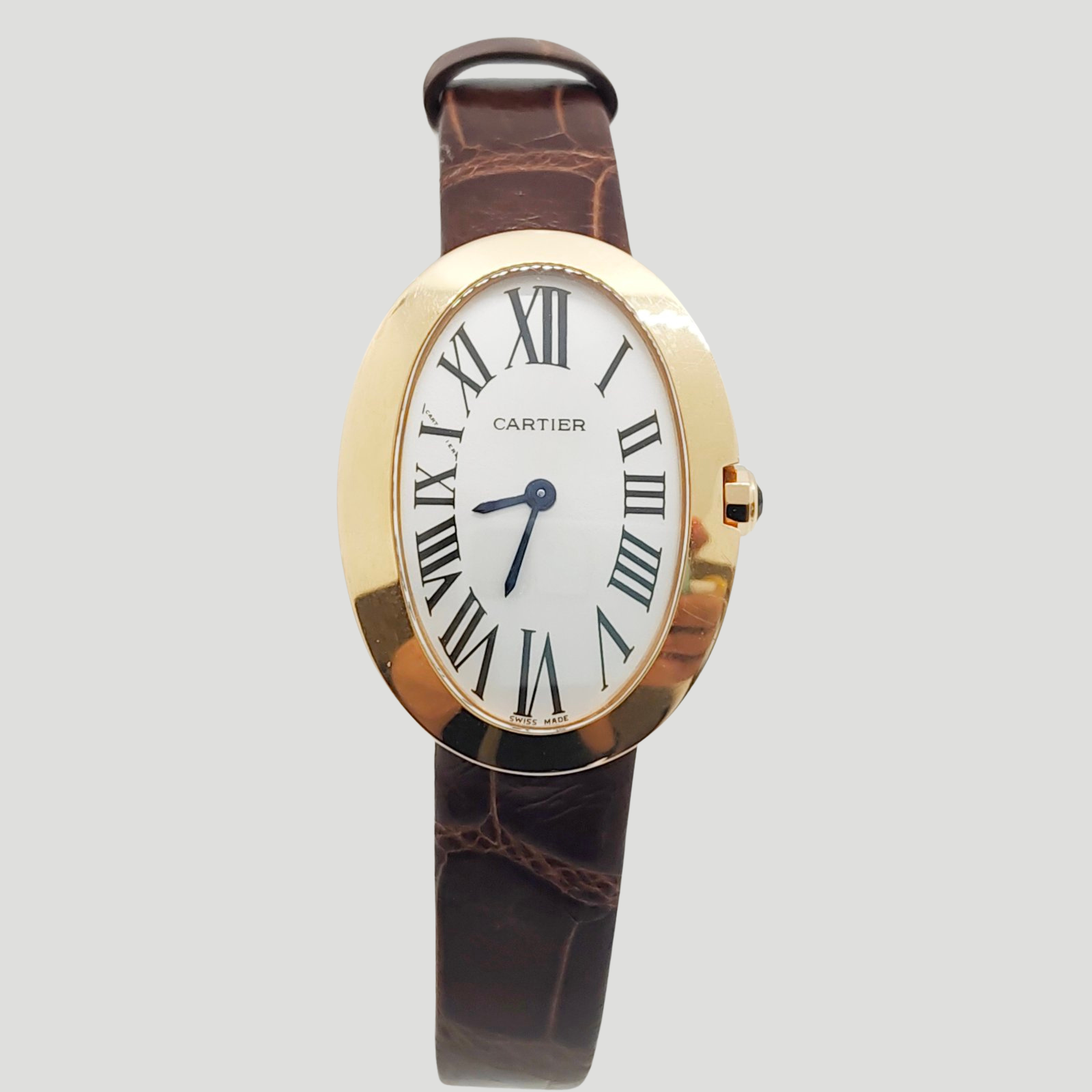 Experience timeless elegance with the Cartier Baignoire Large Model, reference 3064. Crafted in luxurious 18k yellow gold, this piece showcases Cartier’s mastery of design with its signature elongated oval case measuring approximately 31 x 24 mm. The clean white dial, adorned with bold Roman numerals and blued steel hands, captures the Maison's unmistakable aesthetic, while the sapphire cabochon crown adds a refined finishing touch. Paired with a supple brown crocodile leather strap, this watch effortlessly transitions from day to evening, making it a versatile addition to any collection.