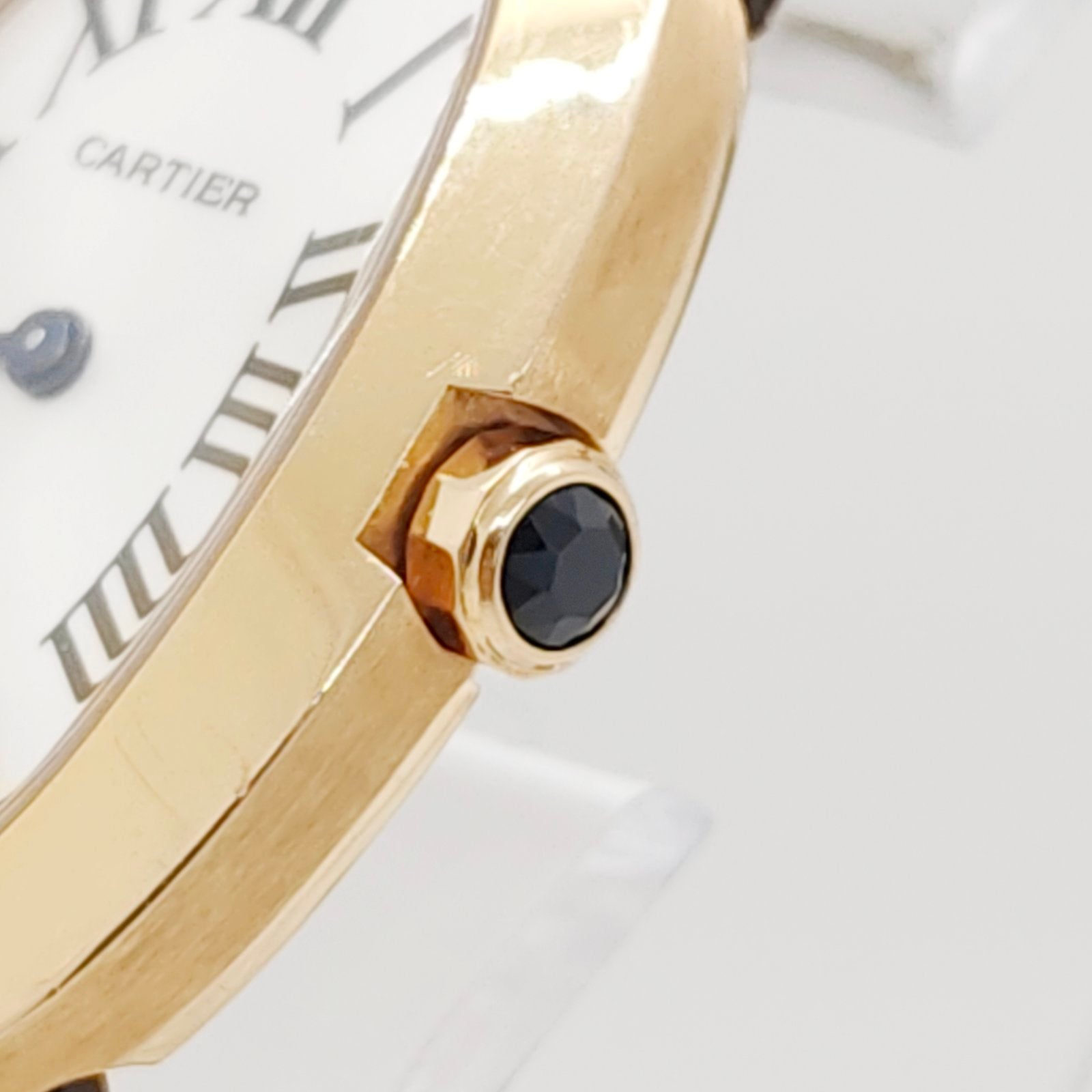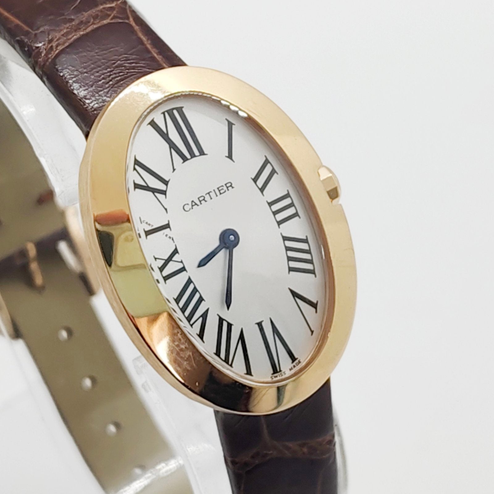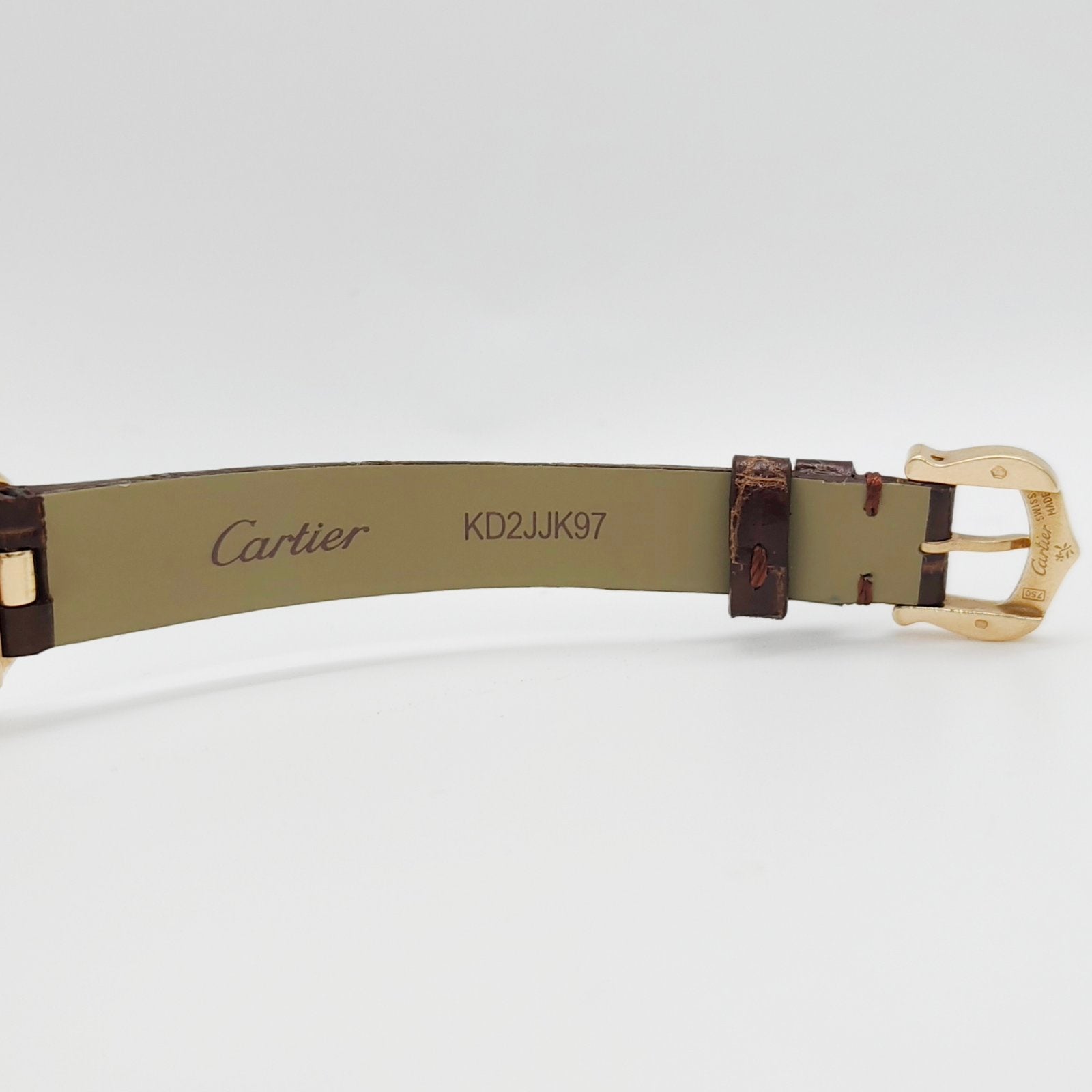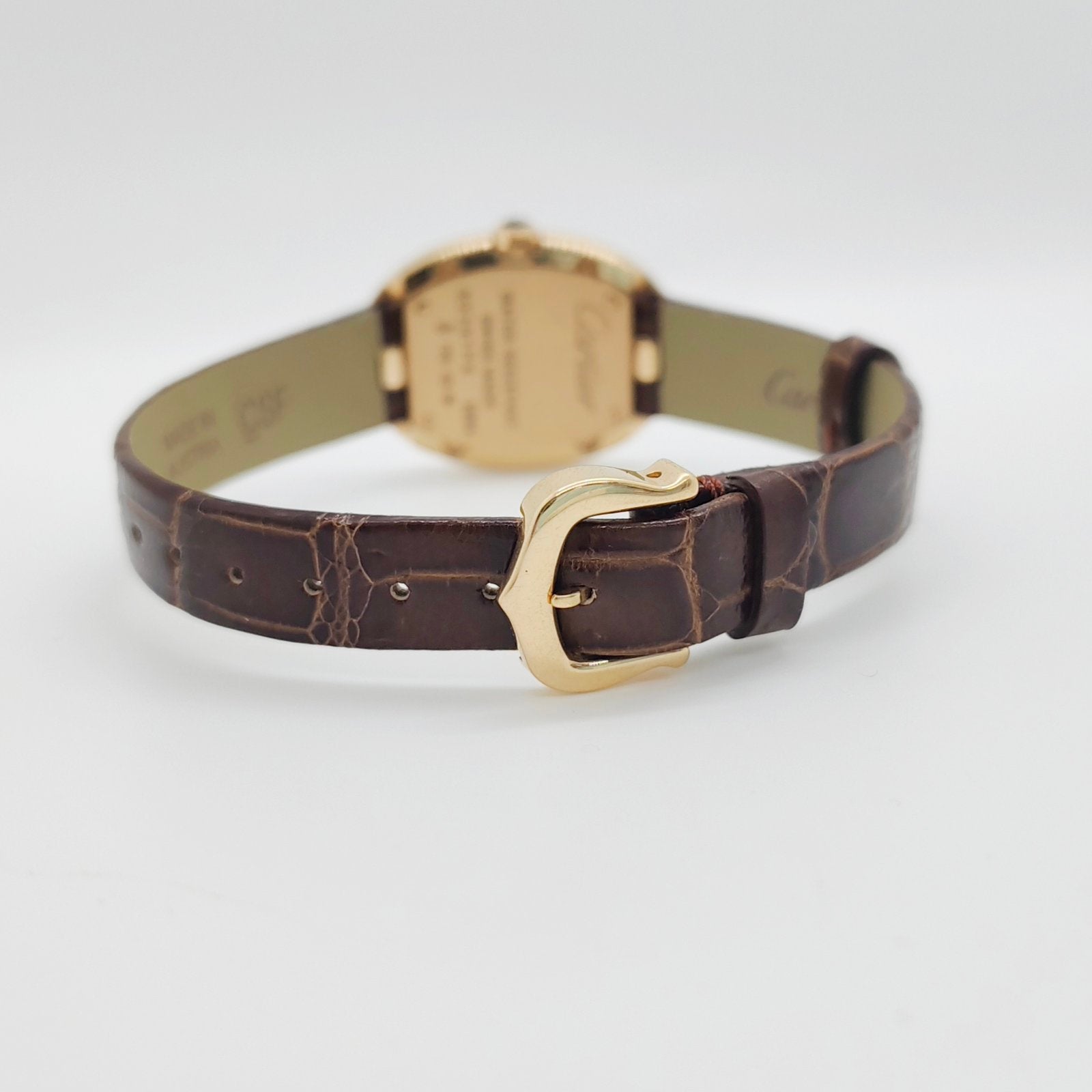 Experience timeless elegance with the Cartier Baignoire Large Model, reference 3064. Crafted in luxurious 18k yellow gold, this piece showcases Cartier’s mastery of design with its signature elongated oval case measuring approximately 31 x 24 mm. The clean white dial, adorned with bold Roman numerals and blued steel hands, captures the Maison's unmistakable aesthetic, while the sapphire cabochon crown adds a refined finishing touch. Paired with a supple brown crocodile leather strap, this watch effortlessly transitions from day to evening, making it a versatile addition to any collection.