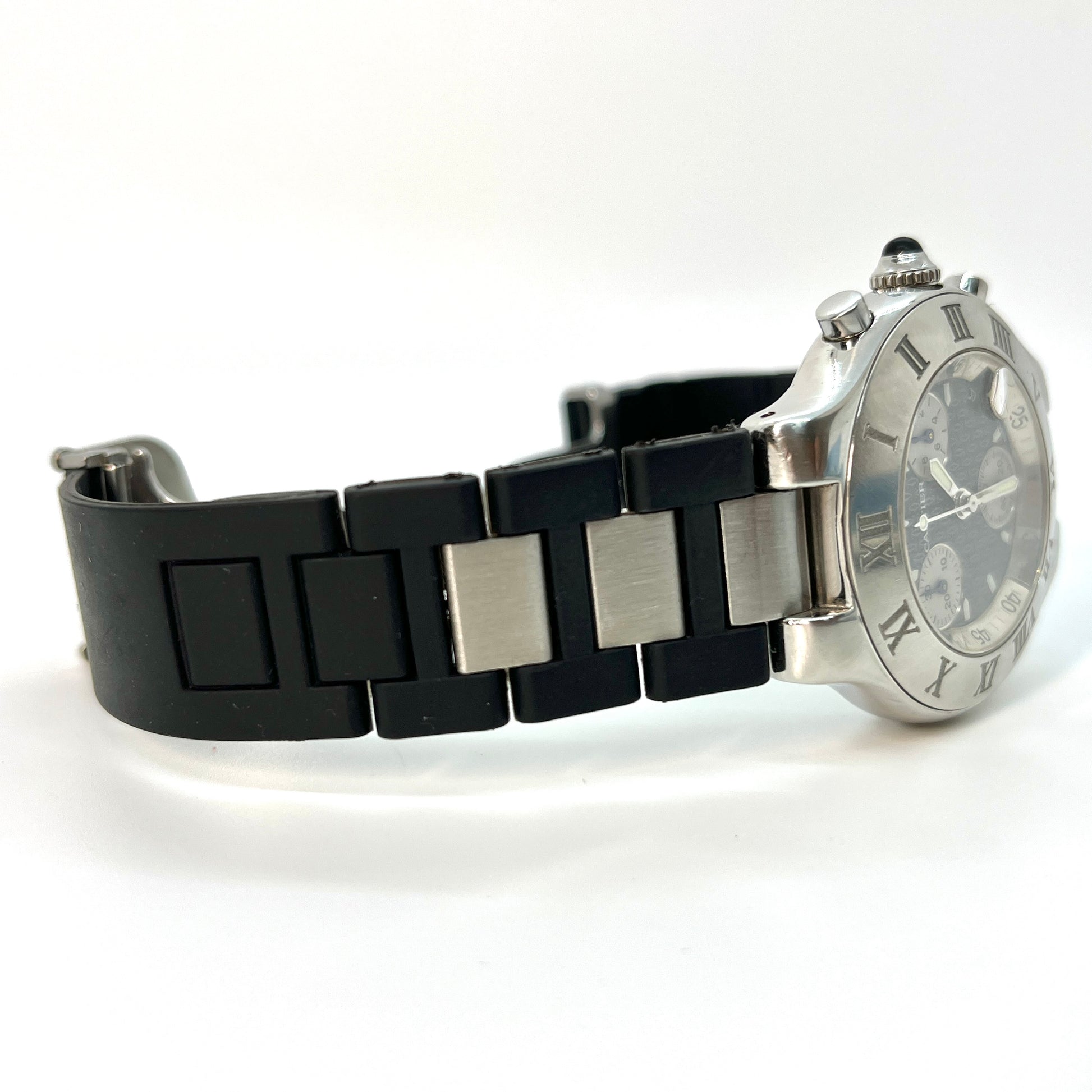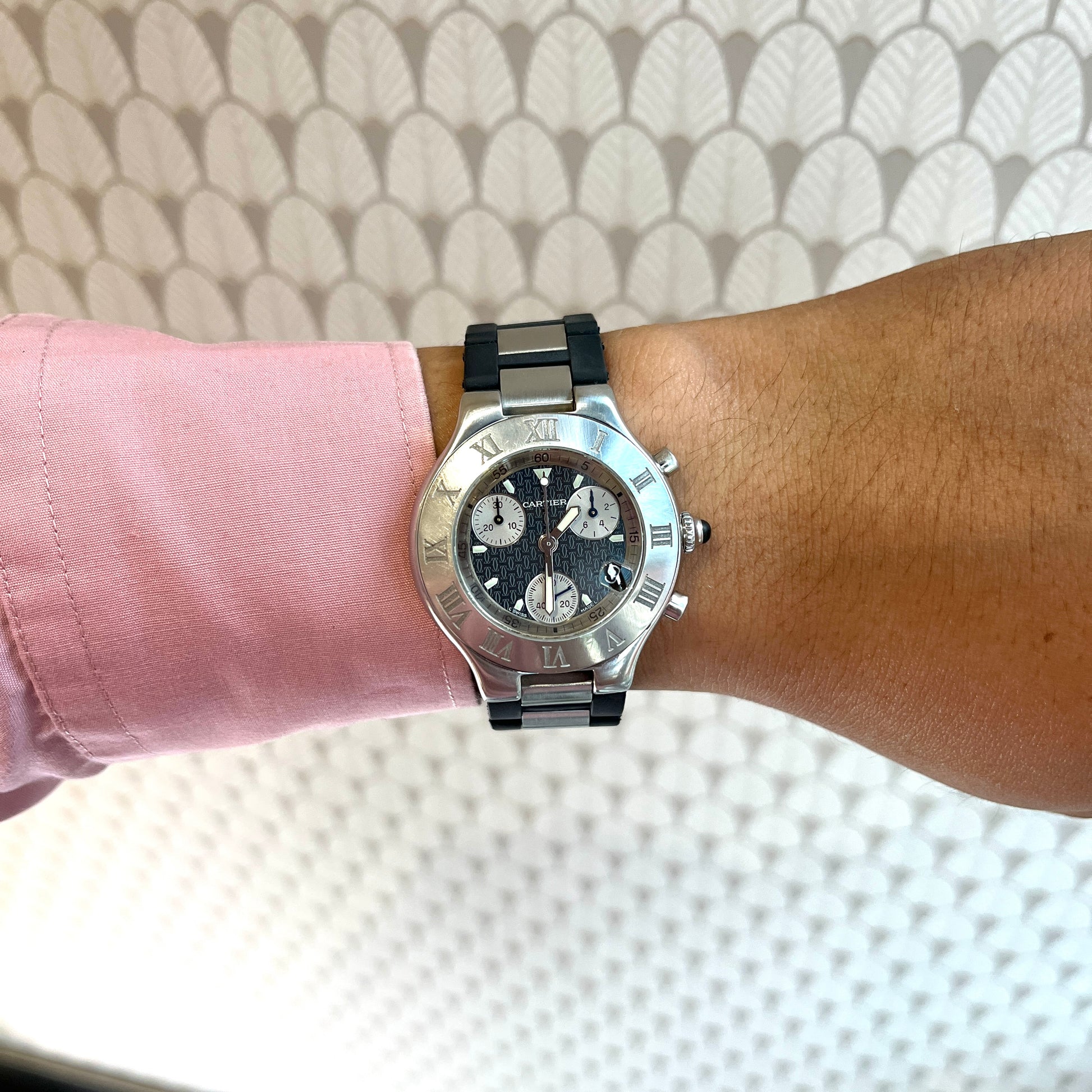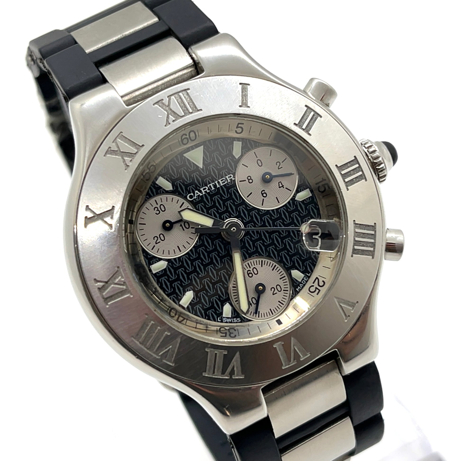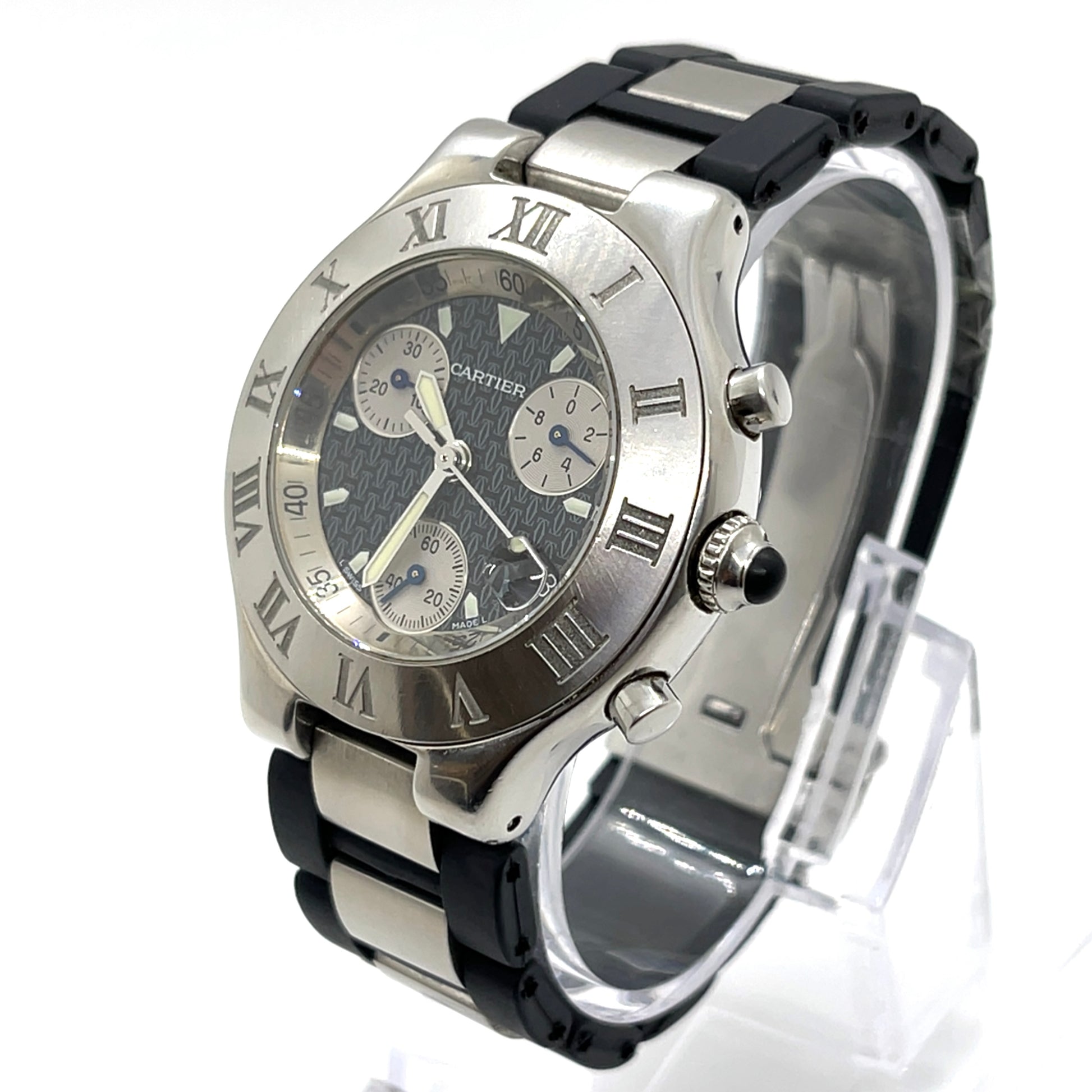 The Cartier "Must 21 Chronoscaph" is a unique timepiece that skillfully combines elegance with a sporty edge. This model embodies Cartier's refined aesthetic while also providing the ruggedness and high functionality expected of a sports watch. The case and bracelet feature a modern and stylish blend of stainless steel and rubber, offering both durability and versatility for everyday use. Equipped with a chronograph function, it’s a practical and appealing choice for those with a taste for sporty features. The Must 21 Chronoscaph seamlessly balances Cartier's signature elegance with sporty practicality, making it a versatile piece that complements both formal and casual attire—a timeless watch designed for long-lasting enjoyment.