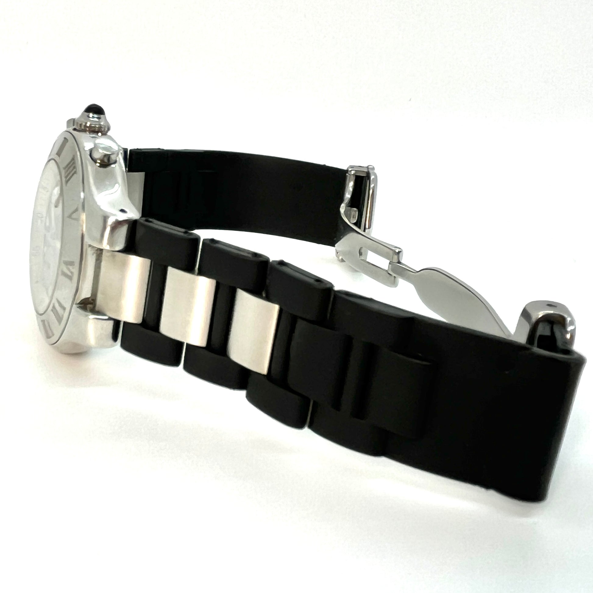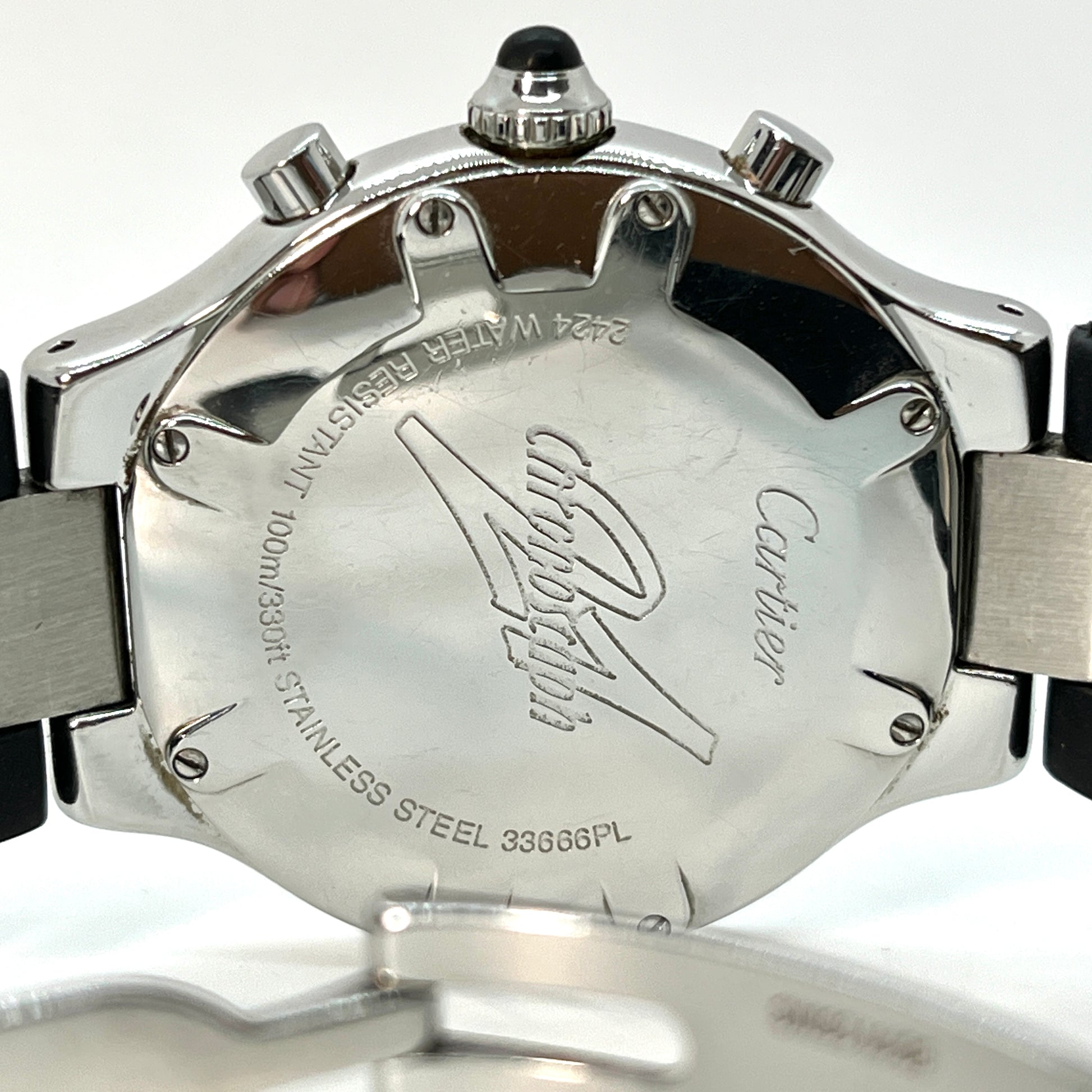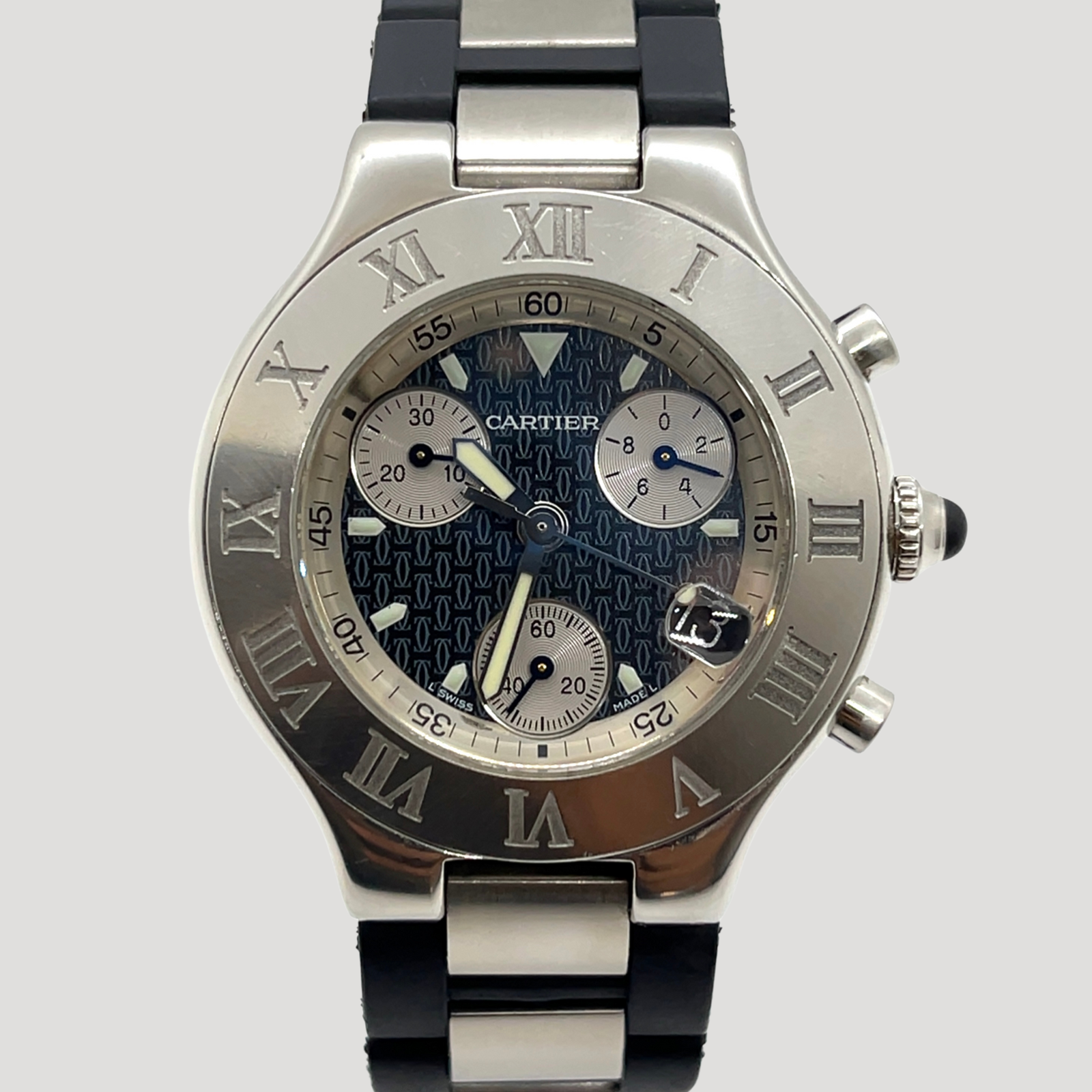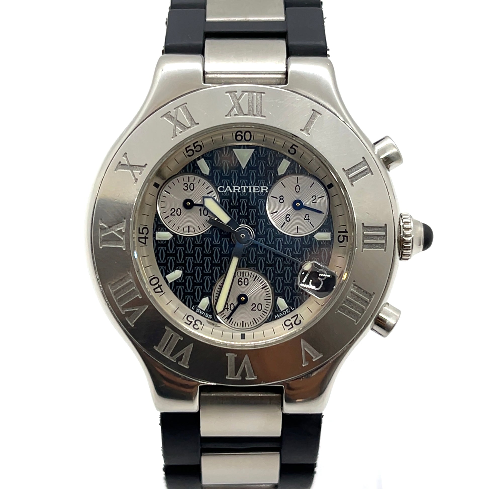 The Cartier "Must 21 Chronoscaph" is a unique timepiece that skillfully combines elegance with a sporty edge. This model embodies Cartier's refined aesthetic while also providing the ruggedness and high functionality expected of a sports watch. The case and bracelet feature a modern and stylish blend of stainless steel and rubber, offering both durability and versatility for everyday use. Equipped with a chronograph function, it’s a practical and appealing choice for those with a taste for sporty features. The Must 21 Chronoscaph seamlessly balances Cartier's signature elegance with sporty practicality, making it a versatile piece that complements both formal and casual attire—a timeless watch designed for long-lasting enjoyment.