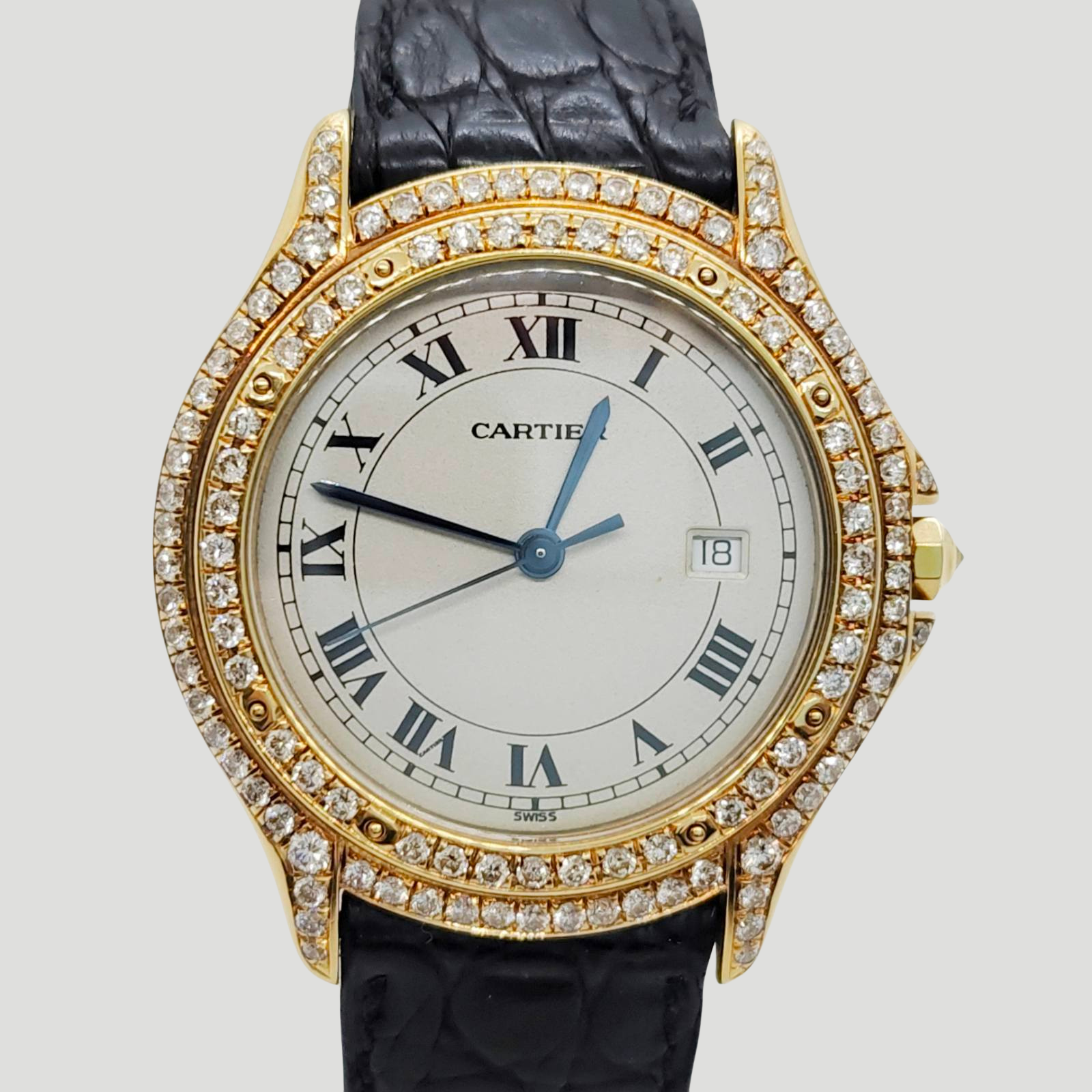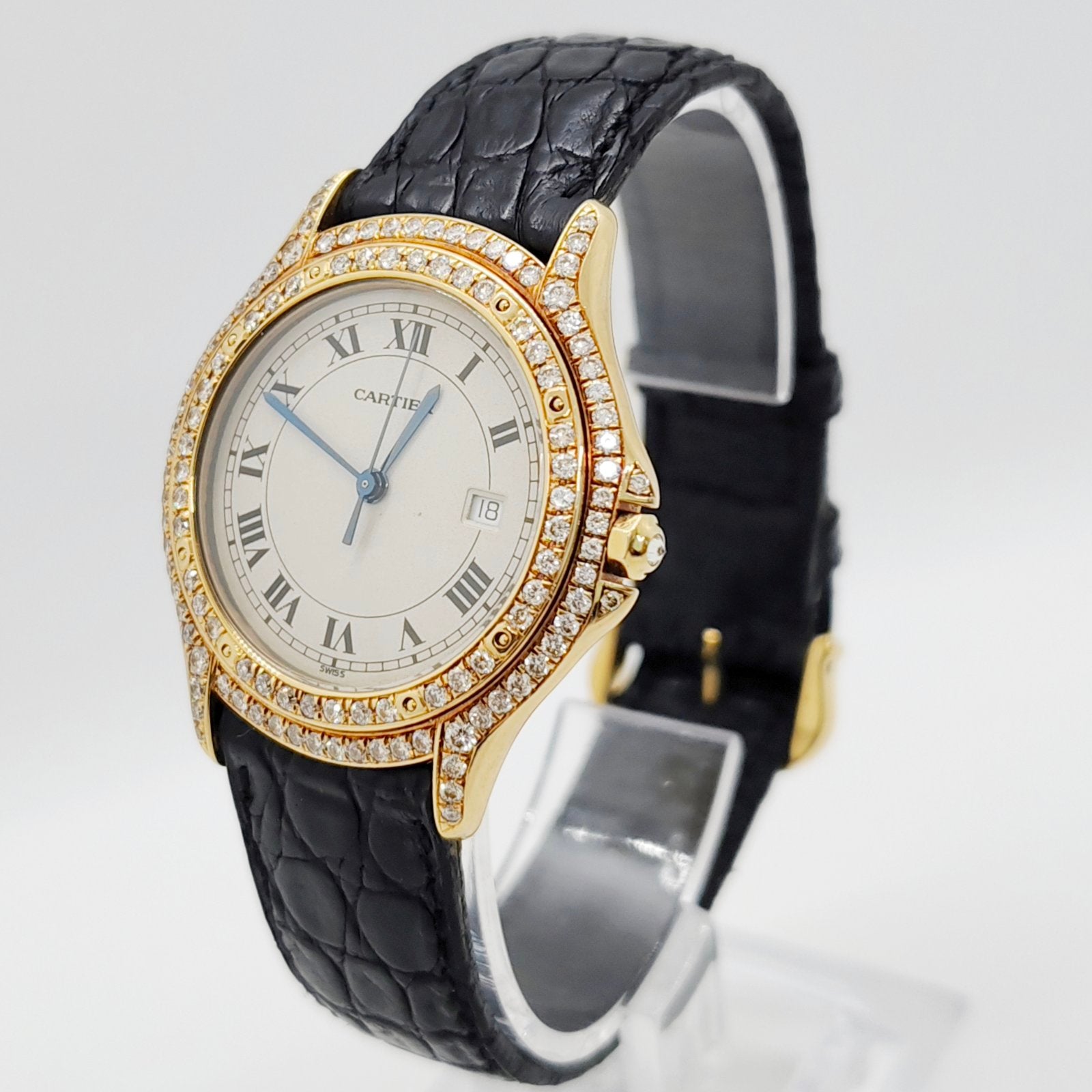 Elevate your collection with the Cartier Cougar, a true icon of luxury and sophistication. Crafted in 18k yellow gold and set with a dazzling double row of brilliant-cut diamonds, this timepiece radiates elegance at every angle. The silvered dial with bold Roman numerals, blued steel hands, and a practical date display at 3 o’clock reflects Cartier’s signature blend of timeless design and precision. Its round case and refined proportions make it a versatile choice, perfect for both everyday elegance and special occasions.