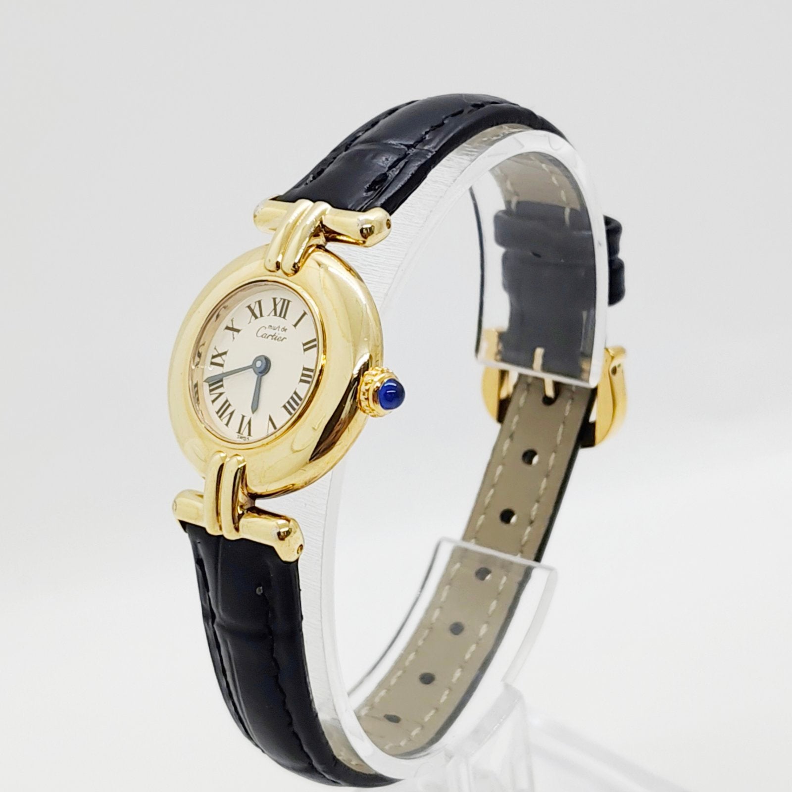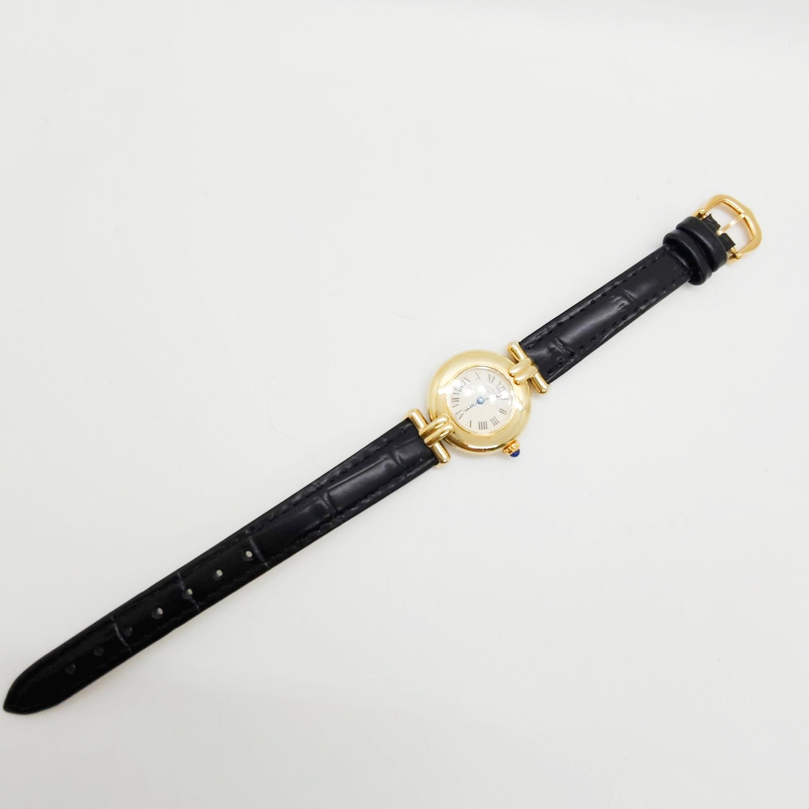 Elevate your style with this elegant Cartier Must de Cartier Colisée, a timeless ladies’ timepiece that embodies the brand’s signature sophistication. The round gold-plated vermeil case paired with Cartier’s classic Roman numeral dial creates a look that is both refined and iconic. Its blue cabochon crown and blued hands add a touch of luxury, making it an excellent choice for women who appreciate understated elegance with unmistakable Cartier charm.