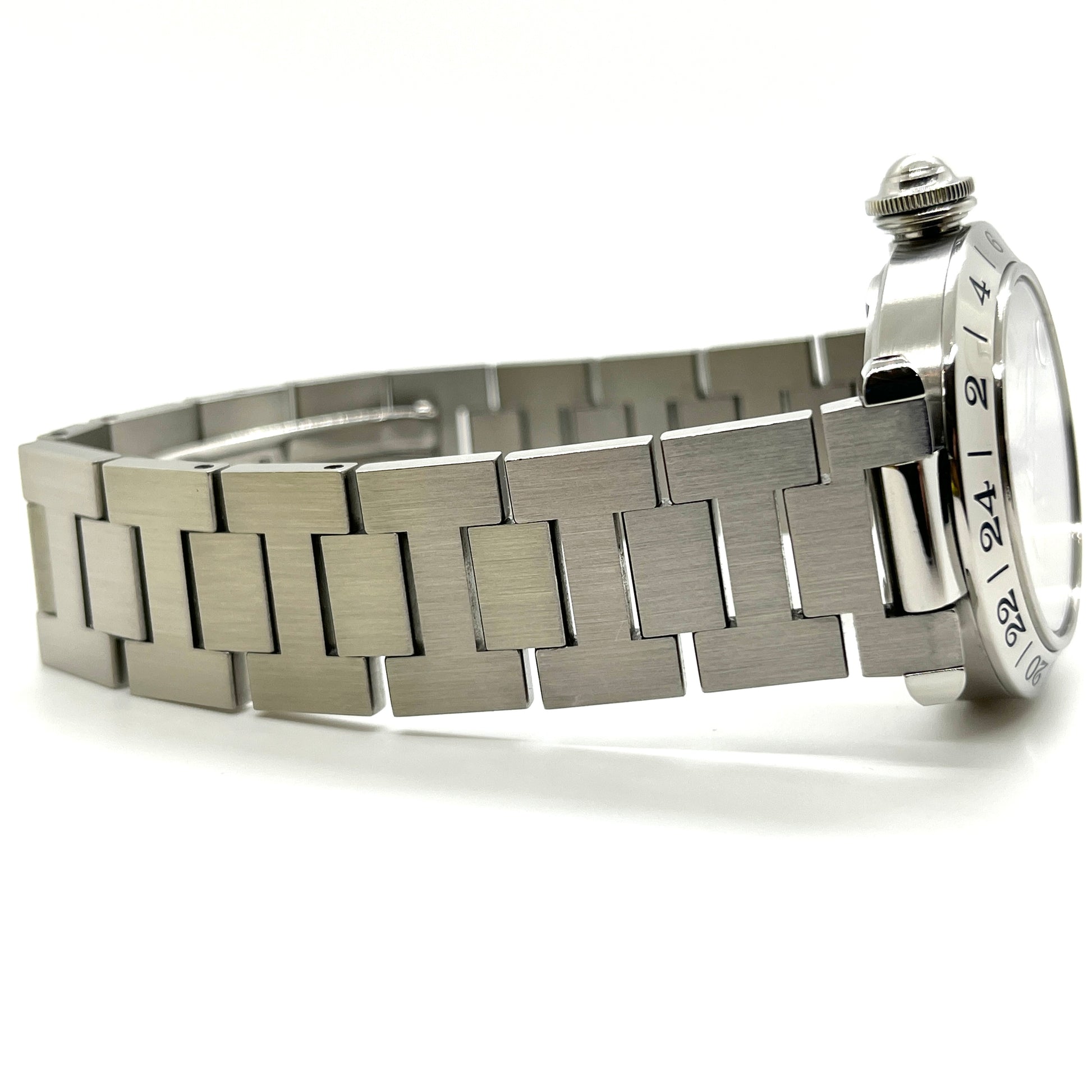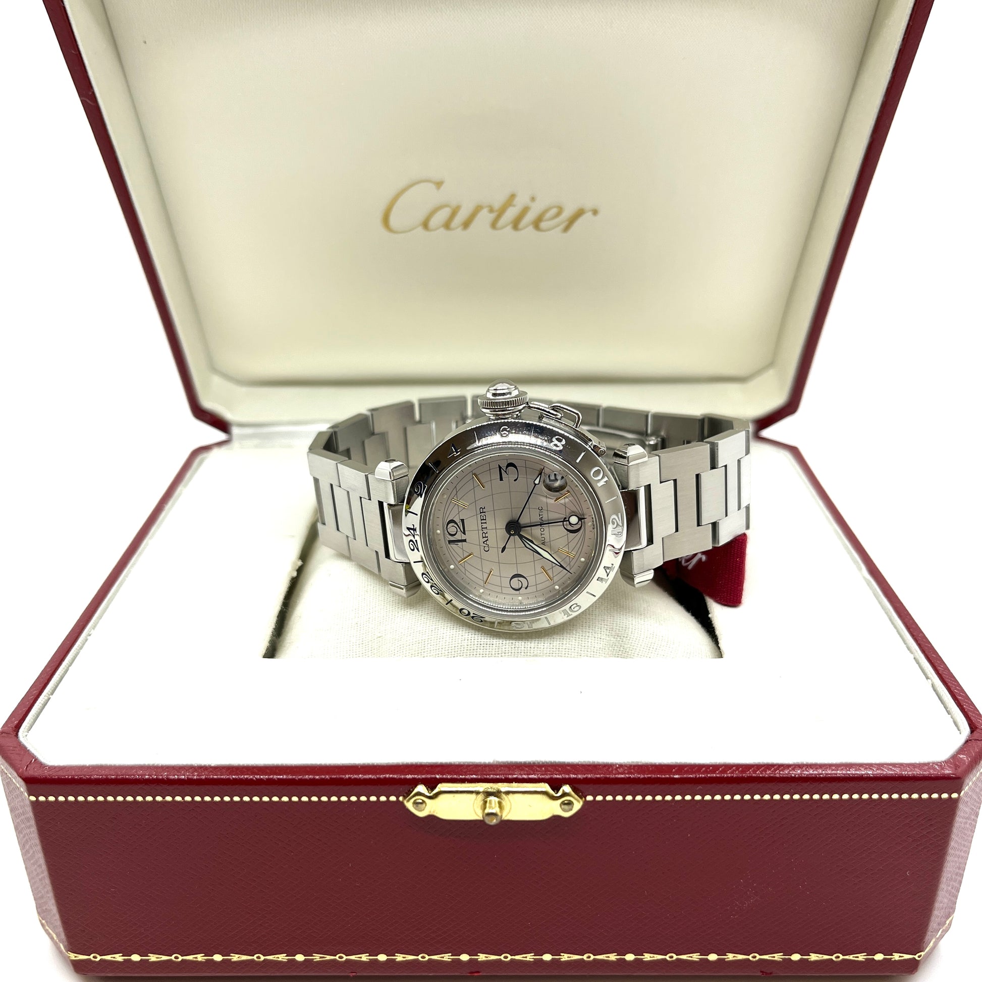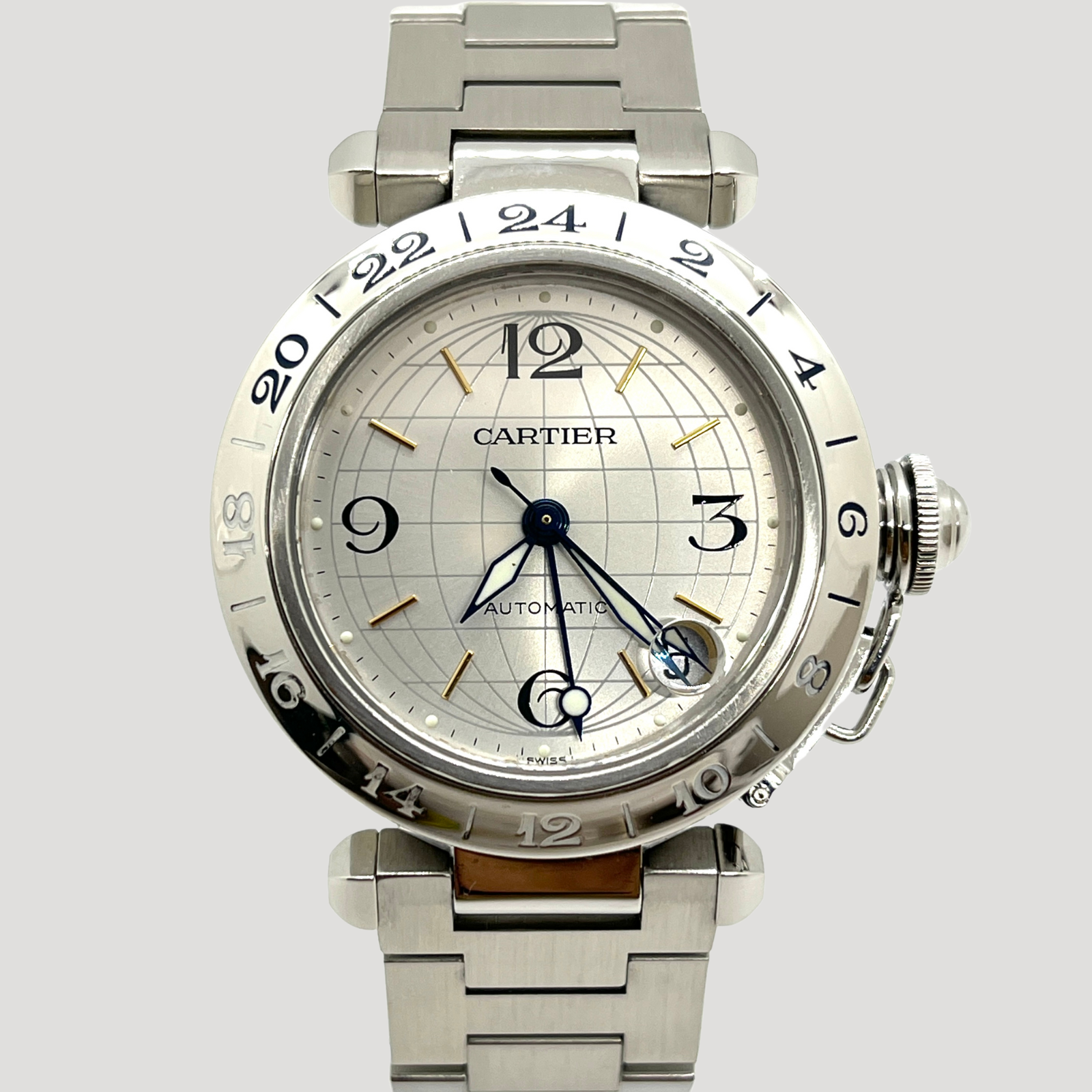 This Cartier Pasha C Meridian features a GMT function, bold numerals, and a distinctive stepped dial design. Simple yet sophisticated, this watch exudes unique elegance, making it a versatile choice for both casual and formal wear. As this model is no longer in production, automatic versions in excellent condition are becoming increasingly rare and desirable. This watch is in superb condition, with no visible dents, chips, or scratches on the case, bezel, sapphire crystal, crown, dial, or bracelet. We’re confident you’ll be thrilled with its exceptional quality upon receipt.