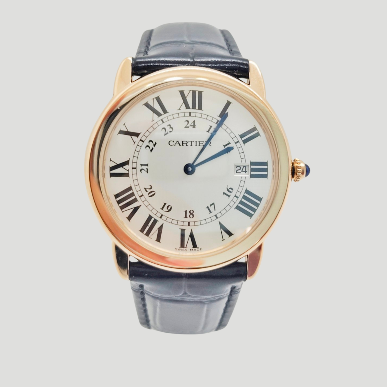 The Cartier Ronde Solo de Cartier Ref. W6701008 showcases timeless elegance in a refined 18k rose gold case, perfectly embodying Cartier’s iconic design language. The silver opaline dial features bold black Roman numerals, a classic chemin de fer minute track, and elegant blued steel sword hands. An inner 24-hour scale adds depth to the dial, while the date window at 3 o’clock provides everyday functionality. The look is completed by Cartier’s signature beaded crown set with a blue sapphire cabochon—an unmistakable hallmark of the Maison.