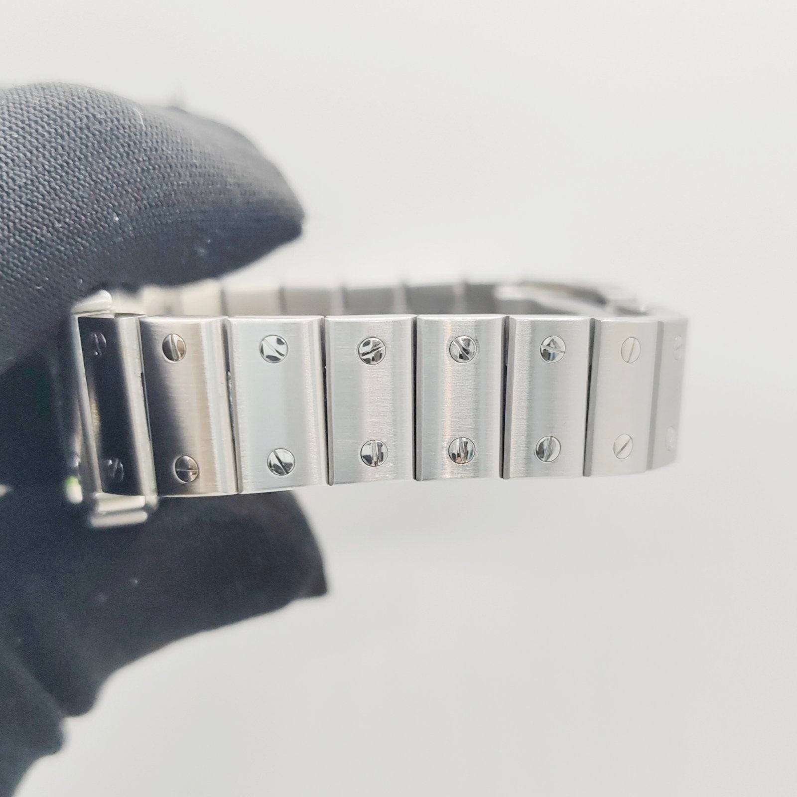Experience timeless elegance with the Cartier Santos Galbée XL Automatic Ref. W20055D6, a modern interpretation of one of Cartier’s most iconic designs. Crafted in stainless steel, this watch features the signature square case with exposed screws, paired with an integrated bracelet that exudes strength and sophistication. Its silvered guilloché dial, bold Roman numerals, and blued-steel sword hands showcase Cartier’s signature aesthetic, while the discreet date display at 4:30 adds everyday practicality.