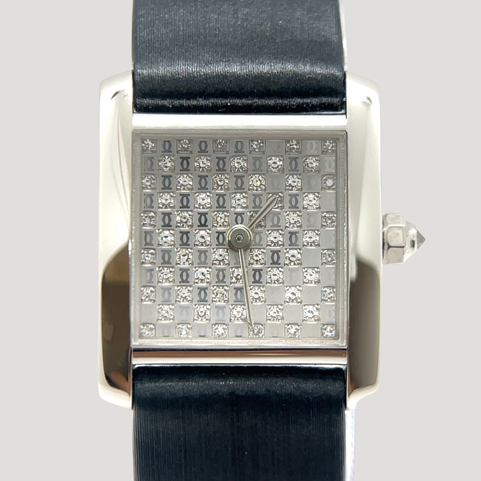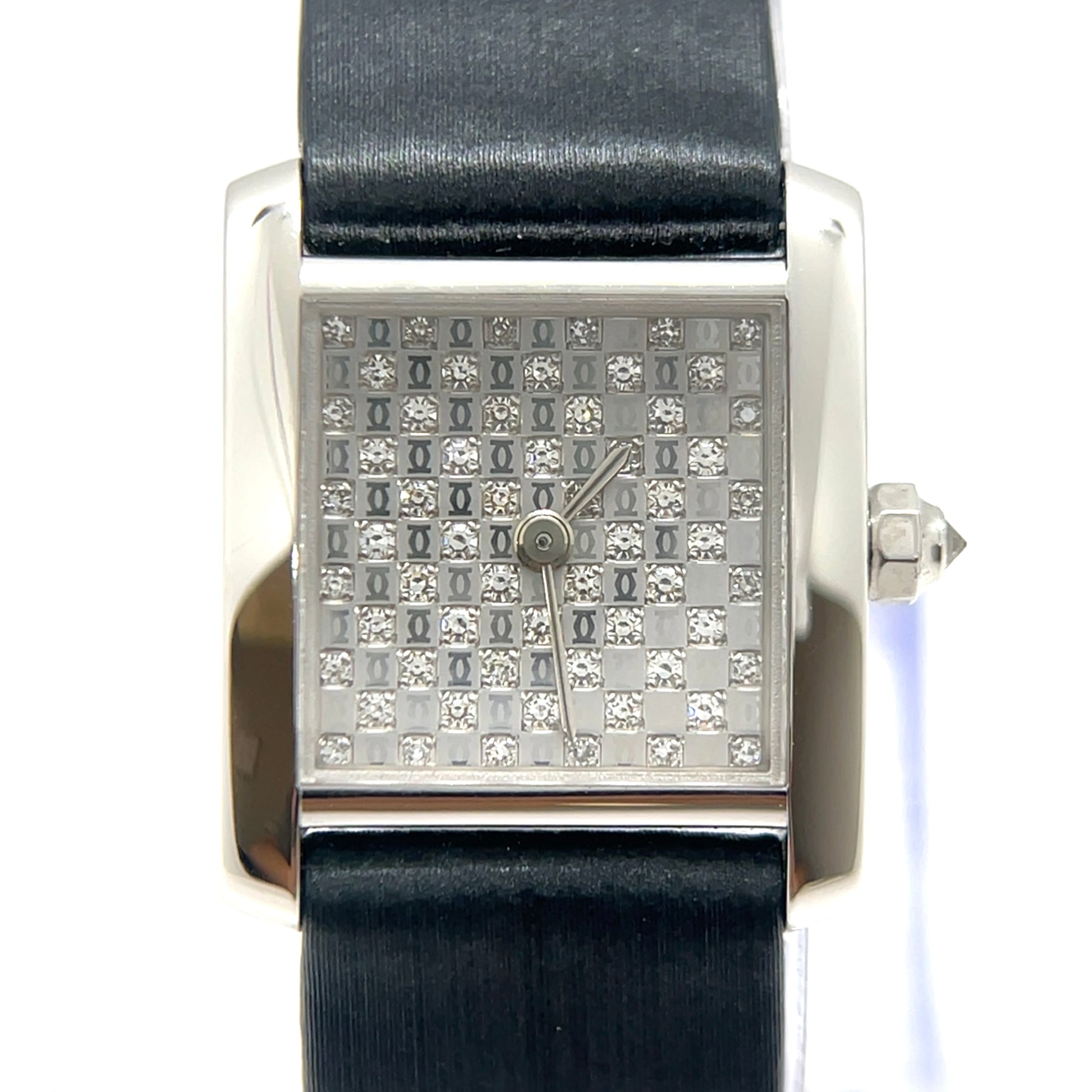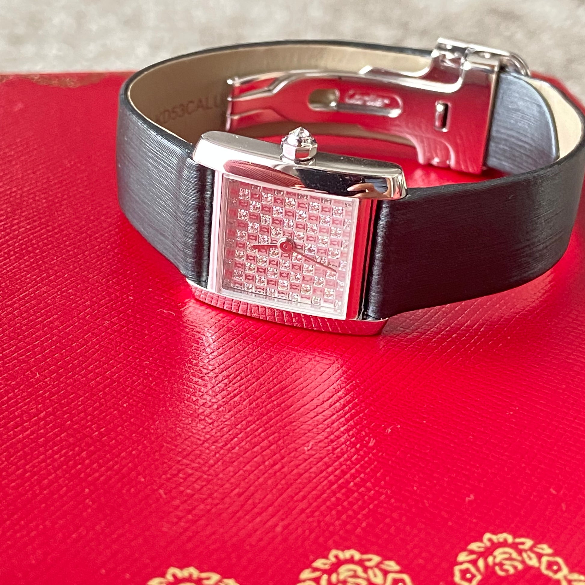 This Tank Française model is part of Cartier's exclusive "Pavé Dial Collection." Unlike regular models, its dial features an alternating pattern of diamonds and the iconic 2C logo, creating a rare and chic look. This special edition embodies both elegance and luxury; the intricately set diamonds in the white gold case radiate a sophisticated brilliance, symbolizing feminine beauty. Crafted with premium materials and Cartier's signature design, it’s adorned with refined accents that make it an exquisite choice for formal settings and parties. The iconic square face design adds a timeless yet modern touch, exuding elegance from every angle. Given its rarity and exquisite craftsmanship, it can also be considered a highly valuable investment piece.