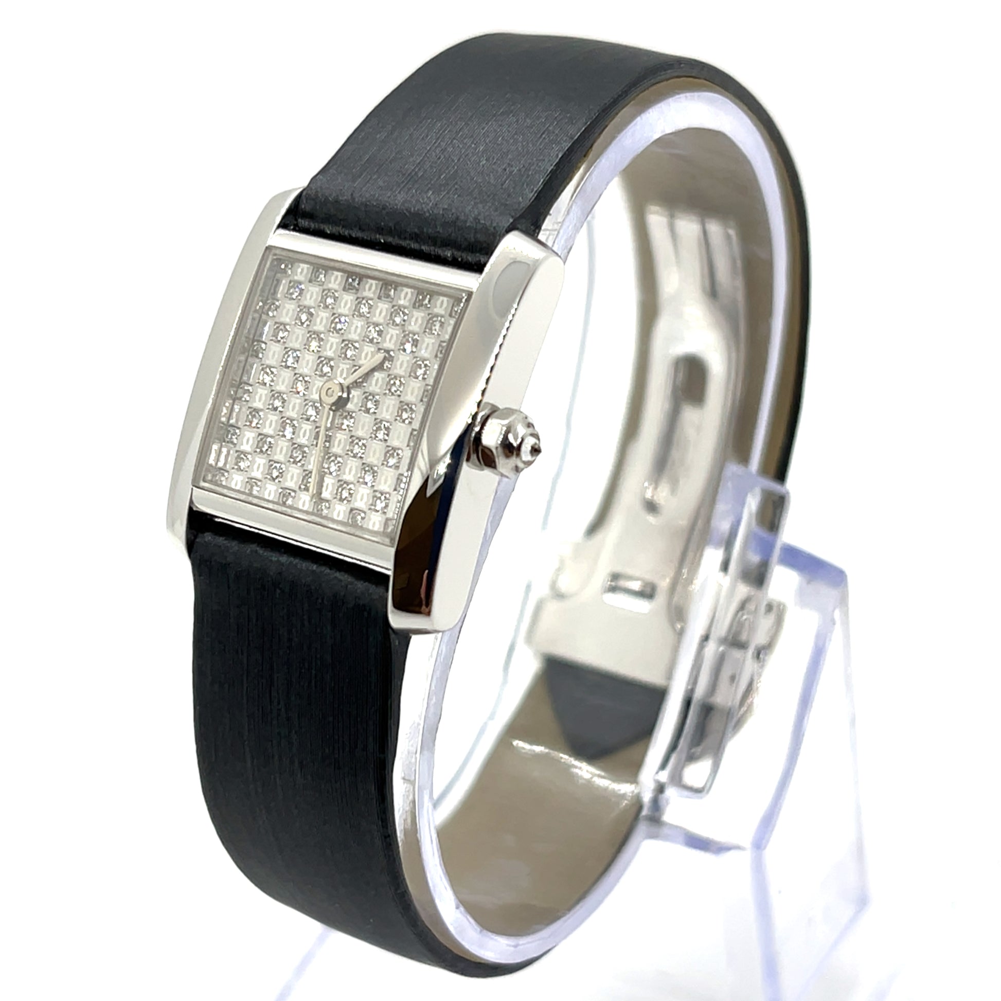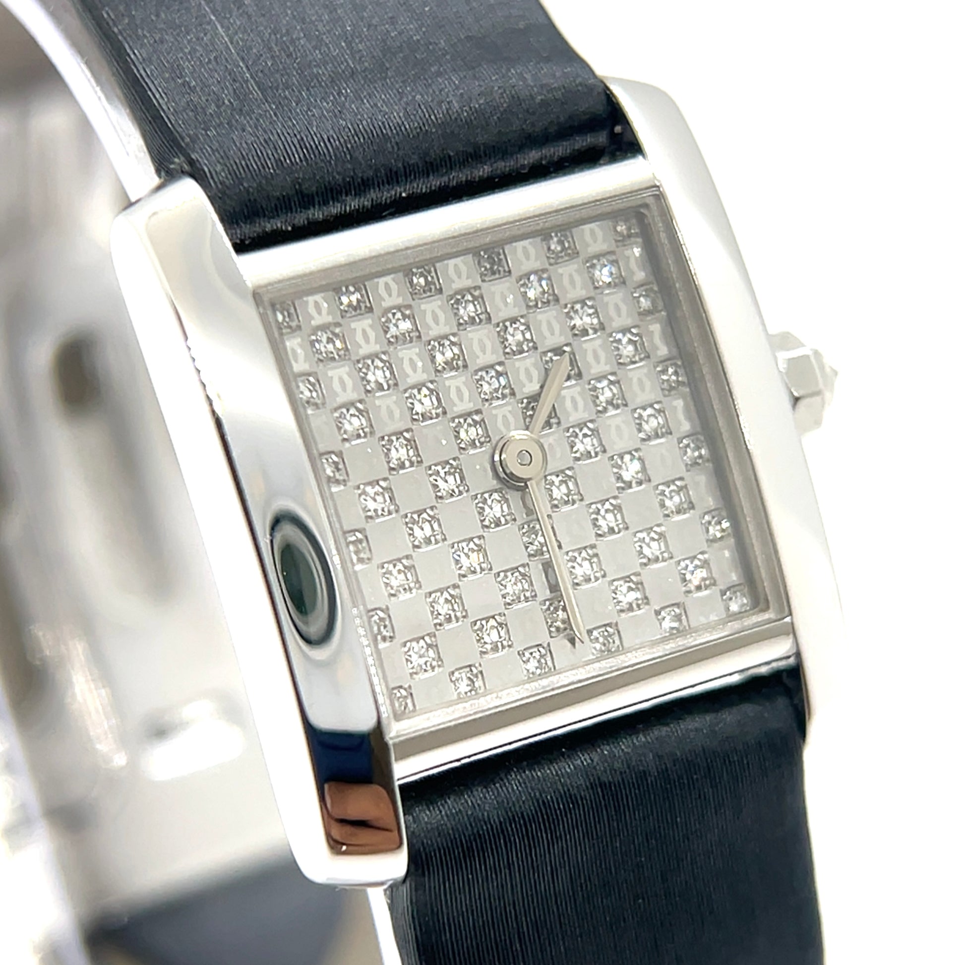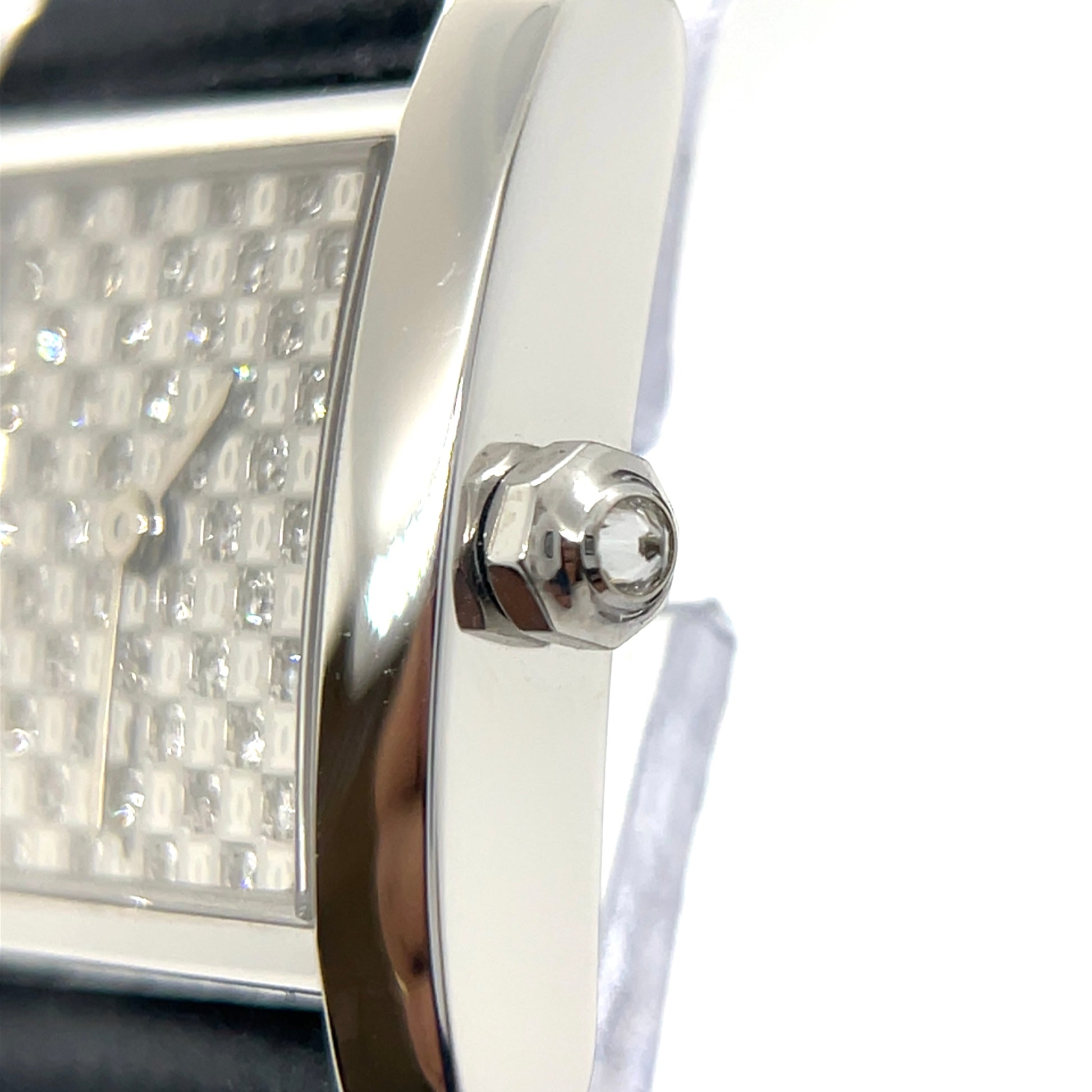 This Tank Française model is part of Cartier's exclusive "Pavé Dial Collection." Unlike regular models, its dial features an alternating pattern of diamonds and the iconic 2C logo, creating a rare and chic look. This special edition embodies both elegance and luxury; the intricately set diamonds in the white gold case radiate a sophisticated brilliance, symbolizing feminine beauty. Crafted with premium materials and Cartier's signature design, it’s adorned with refined accents that make it an exquisite choice for formal settings and parties. The iconic square face design adds a timeless yet modern touch, exuding elegance from every angle. Given its rarity and exquisite craftsmanship, it can also be considered a highly valuable investment piece.