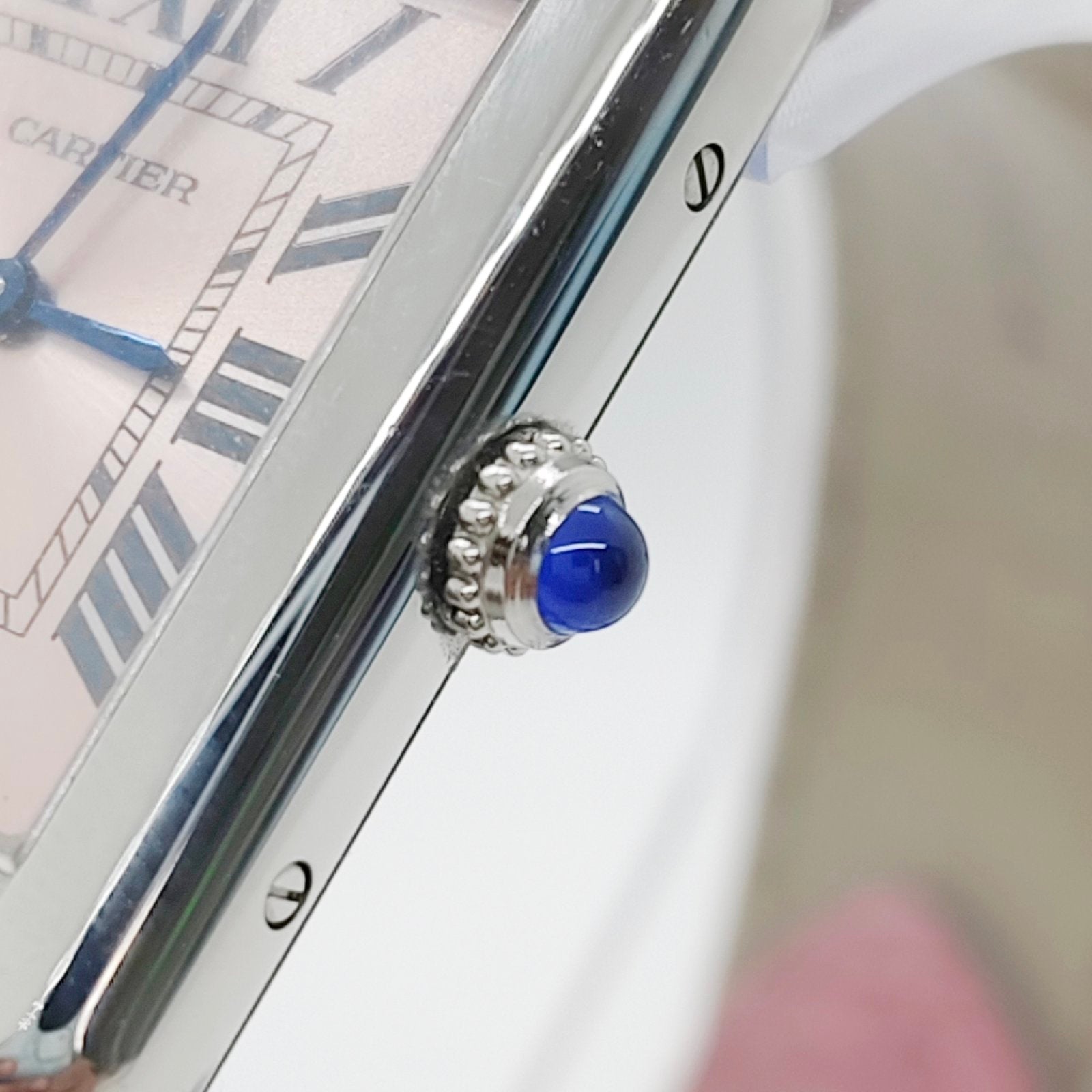 The Cartier Tank Solo Small Model Ref. 3170 is a refined interpretation of Cartier’s legendary Tank design, blending classic elegance with modern simplicity. Crafted in stainless steel, its iconic rectangular case frames a soft pink sunburst dial adorned with bold Roman numerals and blued sword-shaped hands — hallmarks of Cartier’s timeless aesthetic. The blue cabochon crown adds a signature touch of luxury, while the slim profile and compact size ensure a graceful fit on the wrist, perfect for those who appreciate understated sophistication.